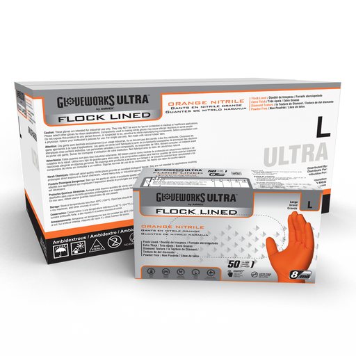 View full detailsGloveworks Ultra Industrial Orange Flock-Lined Raised Diamond Texture Nitrile Disposable Gloves stand up to tough jobs. Sweat-absorbing flocked-lin...